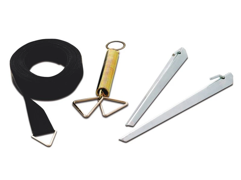 Een universeel inzetbare stormbandset. Kan over de volledige luifel of (voor)tent worden gespannen. Set bestaande uit 1x nylon stormband van 13 meter, 1x een veer en 2x stormharingen.