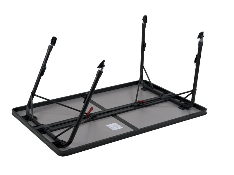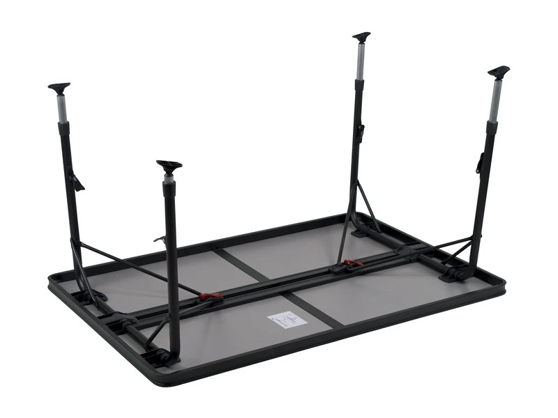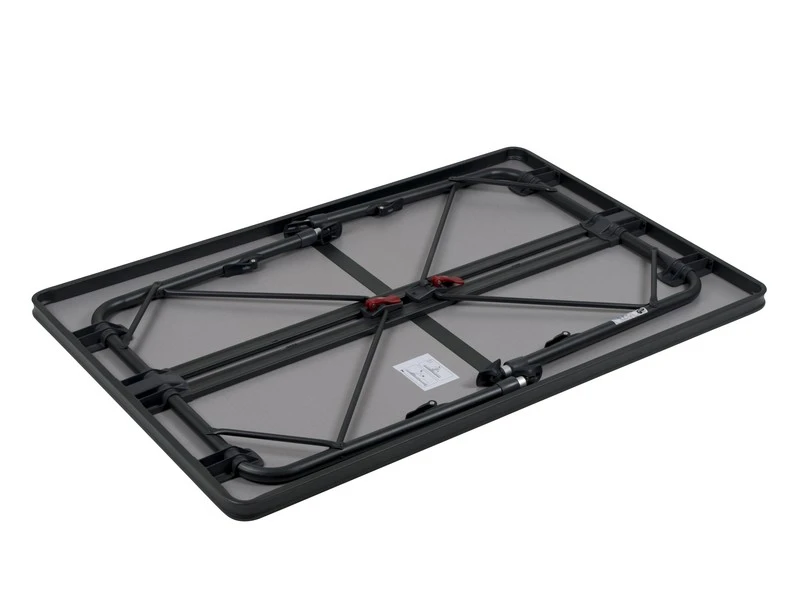 Een zeer stabiele tafel van hoge kwaliteit. Dankzij de speciale constructie is deze tafel eenvoudig in- en uit te klappen. Daarnaast zijn de poten na het inklappen stevig te bevestigen in de geleide aluminium rails aan de onderzijde van het tafelblad. Het tafelblad is extra ruim zodat deze plaats biedt tot 6 personen. De aluminium rails aan de onderzijde van deze campingtafel zorgt eveneens voor extra versteviging. De hoogwaardige materialen en het hittebestendige en watervaste tafelblad zorgen voor een lange levensduur. De poten bieden een hoge stabilteit door de dikke (28 mm) en extra verstevigde buizen. De stabilisatie voetjes zorgen voor extra grip op iedere ondergrond. Deze tafel is licht van gewicht door het aluminium frame.